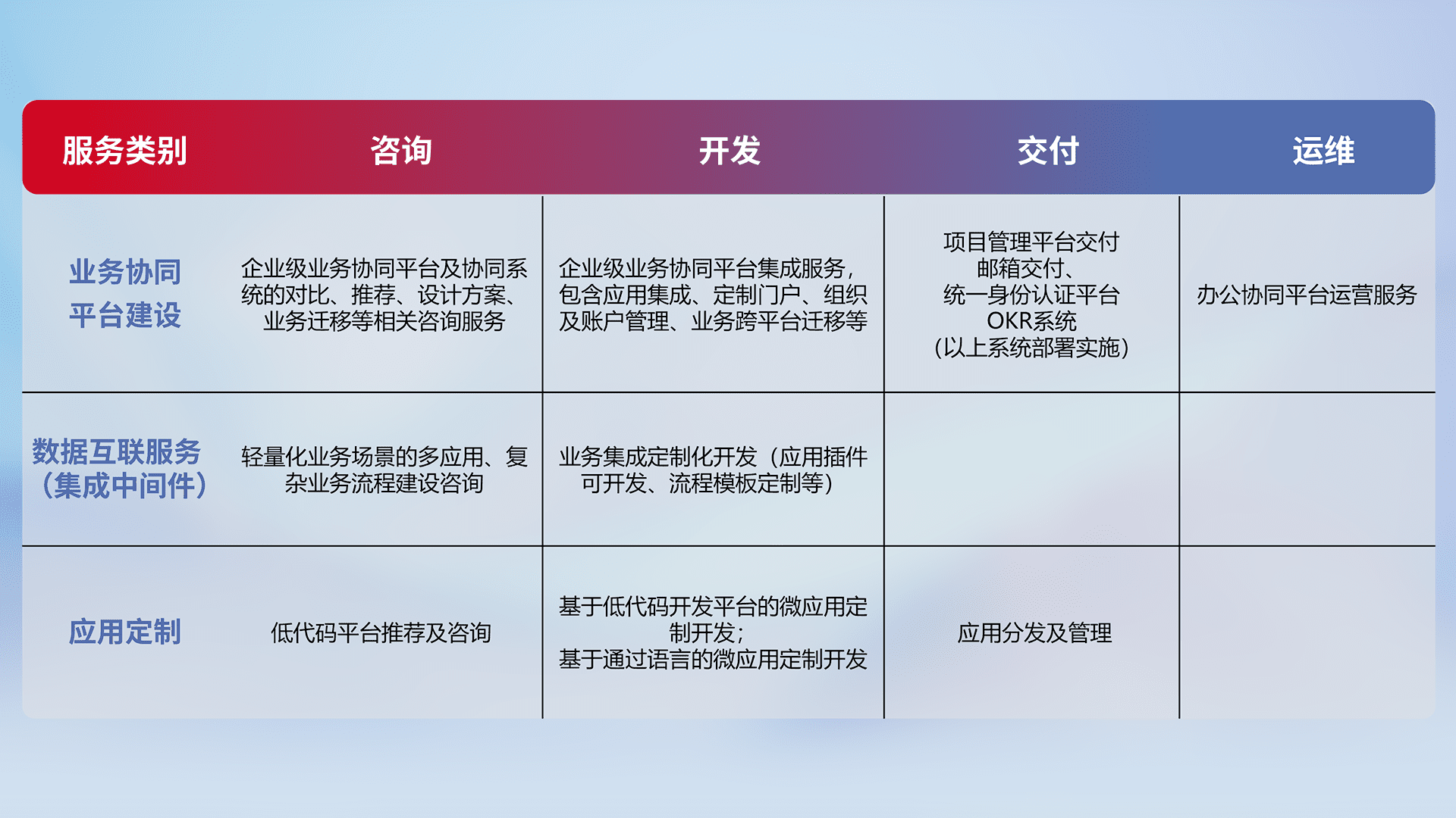 针对钉钉、、、企微、、、IDaas等平台级产品提供产品的规划、、、、方案、、、交付、、、、定制化开发等服务,,,,实现如统一协同办公、、智能客户服务、、、混合会议管理、、、智能数据查询、、等业务场景,,实现数字化转型。。。。
