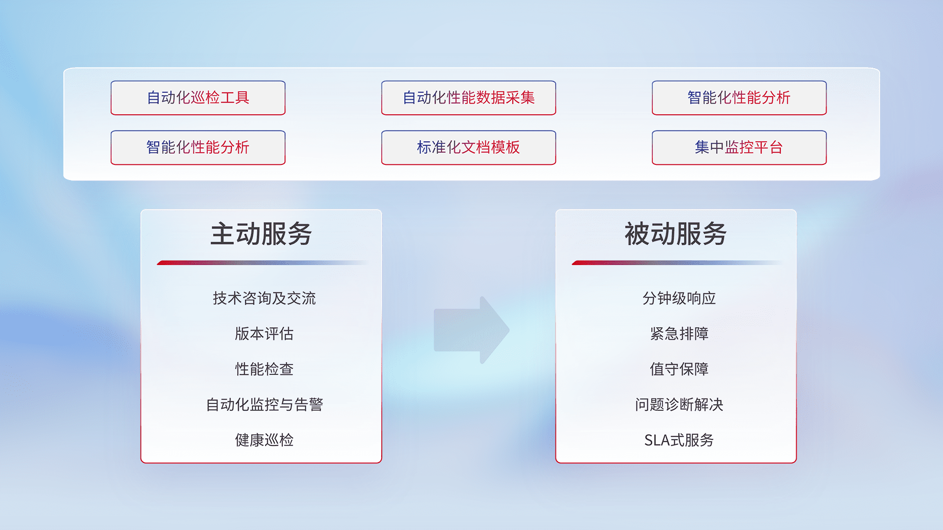 智能化工具和标准化文档,,保障服务质量,,提供主动服务(包含技术咨询、、、、版本评估、、、、性能检查、、、、自动化监控与告警、、、、健康巡检)和被动服务包含(分钟级响应、、、紧急排障、、、、值守保障、、、问题诊断解决、、SLA服务)。。。